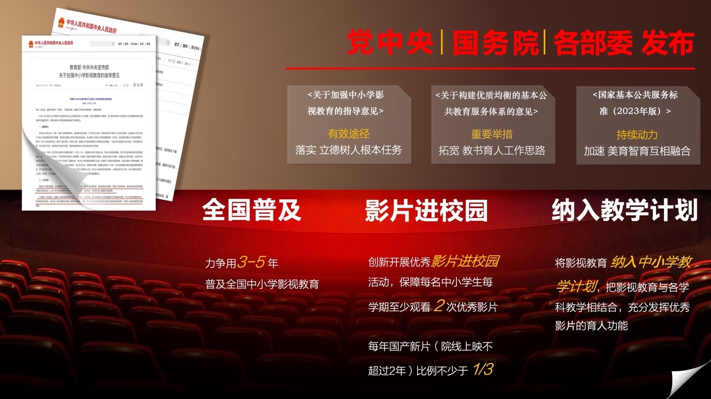 为充分发挥优秀影片在促进中小学生德智体美劳全面发展中的重要作用,,,教育部、、、中共中央宣传部联合发布《关于加强中小学影视教育的指导意见》(教基〔2018〕24号)。。。指导意见明确,,,,力争用3到5年时间,,全国中小学影视教育基本普及,,形式多样、、资源丰富、、、、常态开展的中小学影视教育工作机制基本建立,,,中小学生影视教育活动时间得到切实落实,,,,适合中小学生观看的优秀影片得到充分保障,,,学校、、、青少年校外活动场所和社会观影资源得到有效利用,,形成中小学影视教育的浓厚氛围。。。