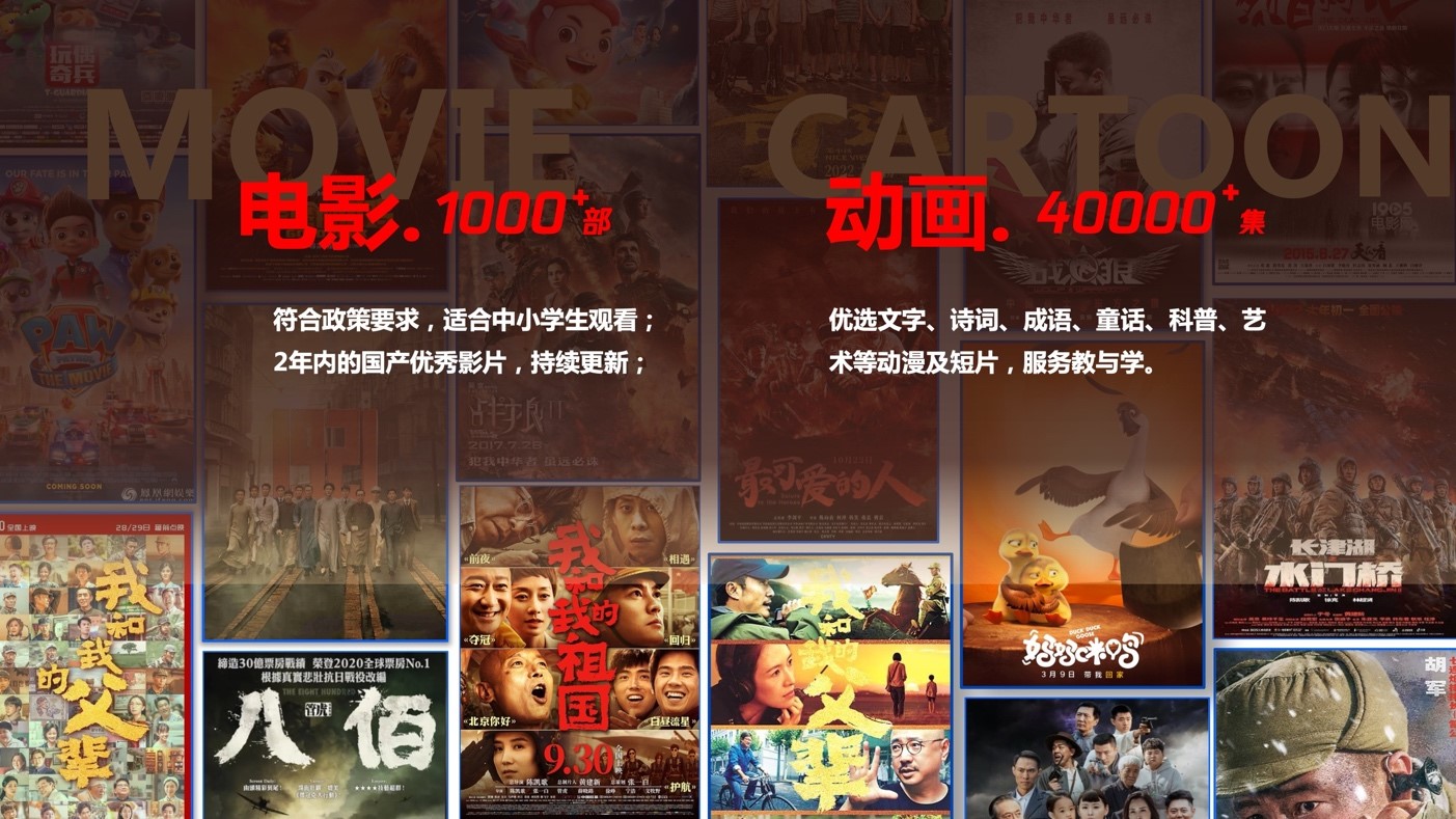 基于精选的教育资源库,,结合学校个性化需求,,每年向学校提供200部电影,,,5000集动画的观影服务。。。。