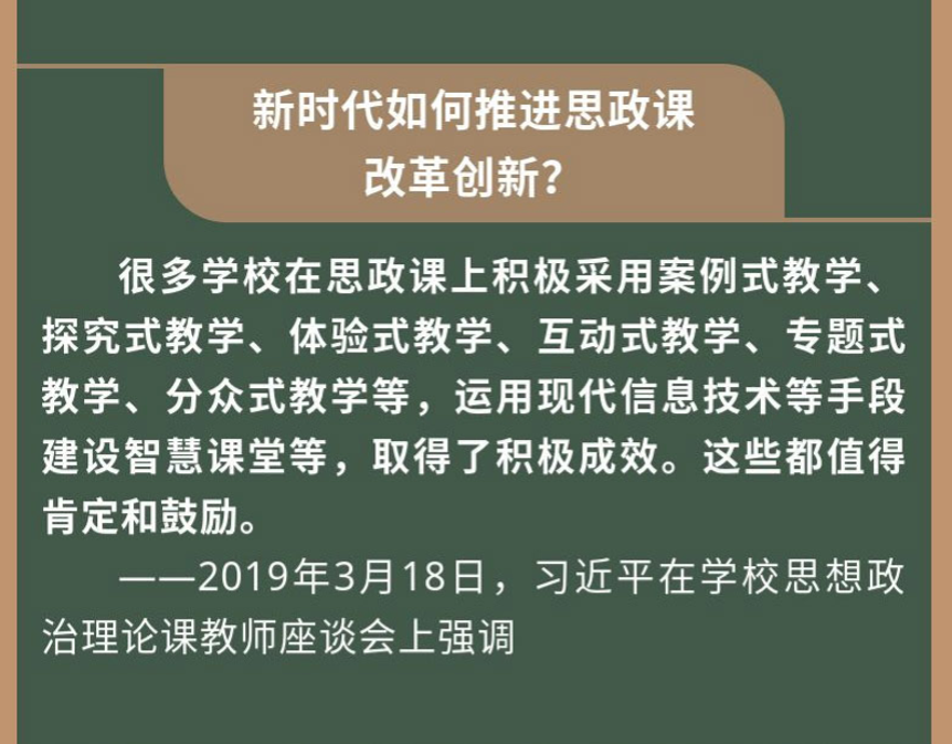 2019年,,习总书记在学校思政理论课教师座谈会上,,,积极鼓励教师在思政课堂上运用现代信息技术等手段来进行思政课的改革创新,,,如学校在思政课上积极采用案例式教学、、、、探究式教学、、专题式教学、、、、体验式教学等。。影视教育采用“电影+课堂”的形式,, 逐渐实现影视教育与德育、、、、语文、、、科学、、历史、、、、地理、、、、艺术等学科教学的有机结合,,,,从而让中小学生在教育中感受世界、、、开阔视野、、、体验情感,,,,促进学生的身心健康和全面发展。。