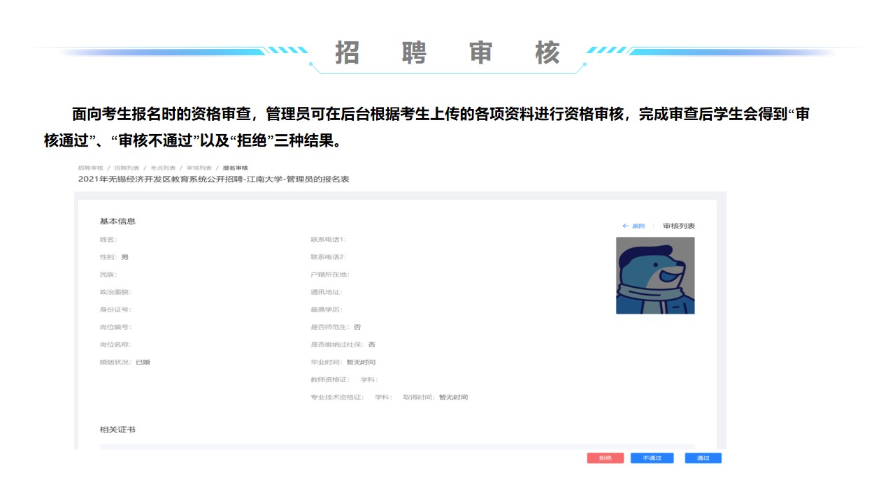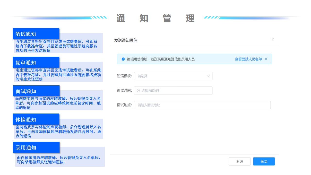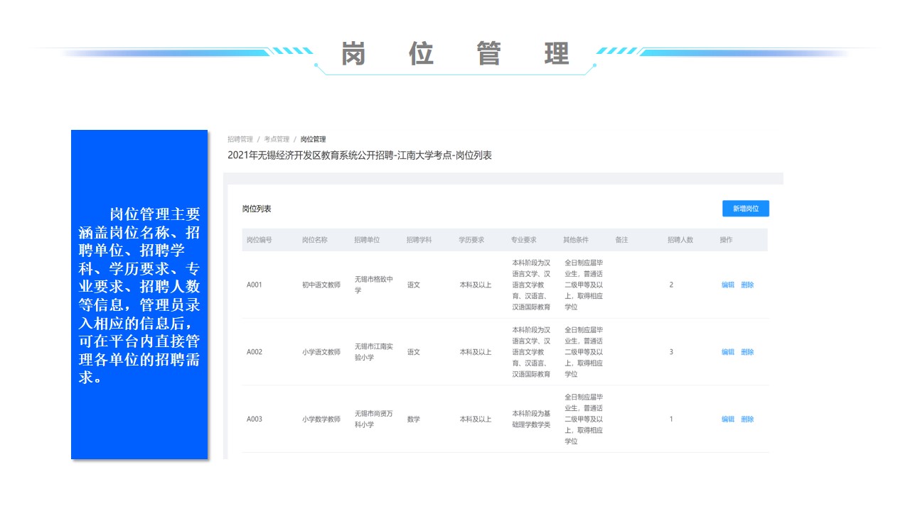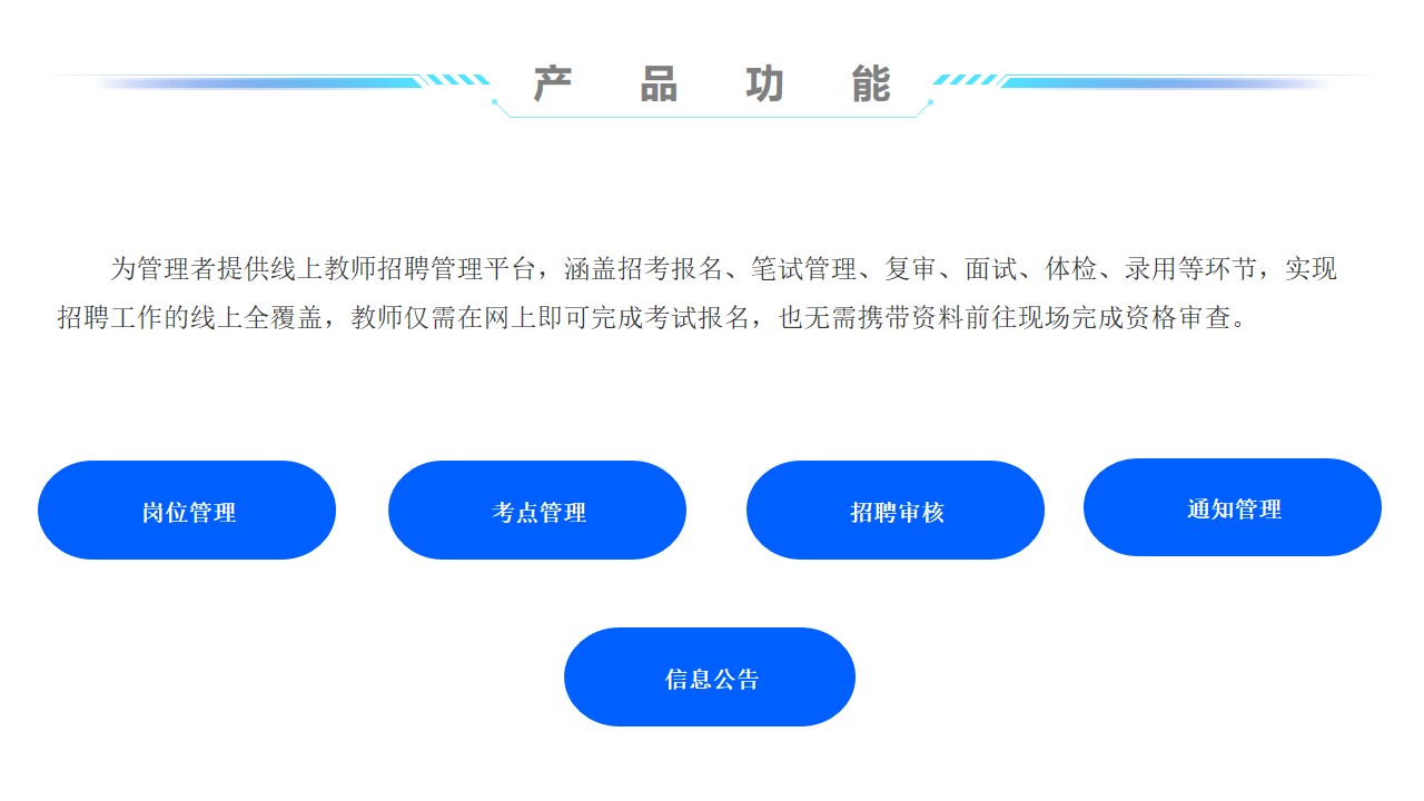 教师招聘系统,,一款线上全覆盖的招聘管理平台,,,,通过岗位管理、、、招聘审核、、通知和信息公告等功能,,,,提高教师招聘效率和品质,,为教育行业的招聘管理提供可靠的动态数据和决策依据。。